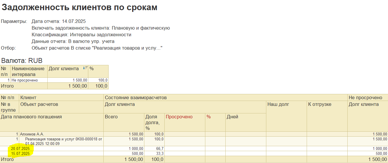 После проведенной корректировки графика взаиморасчетов на дату 14.07.25 видим в отчете новые даты планового погашения и отсутствие просроченной задолженности.