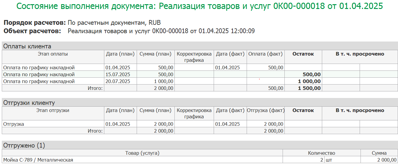 В отчете Состояние выполнения по реализации товаров и услуг будет отображено самое последнее состояние графика оплаты с учетом всех корректировок графика взаиморасчетов.