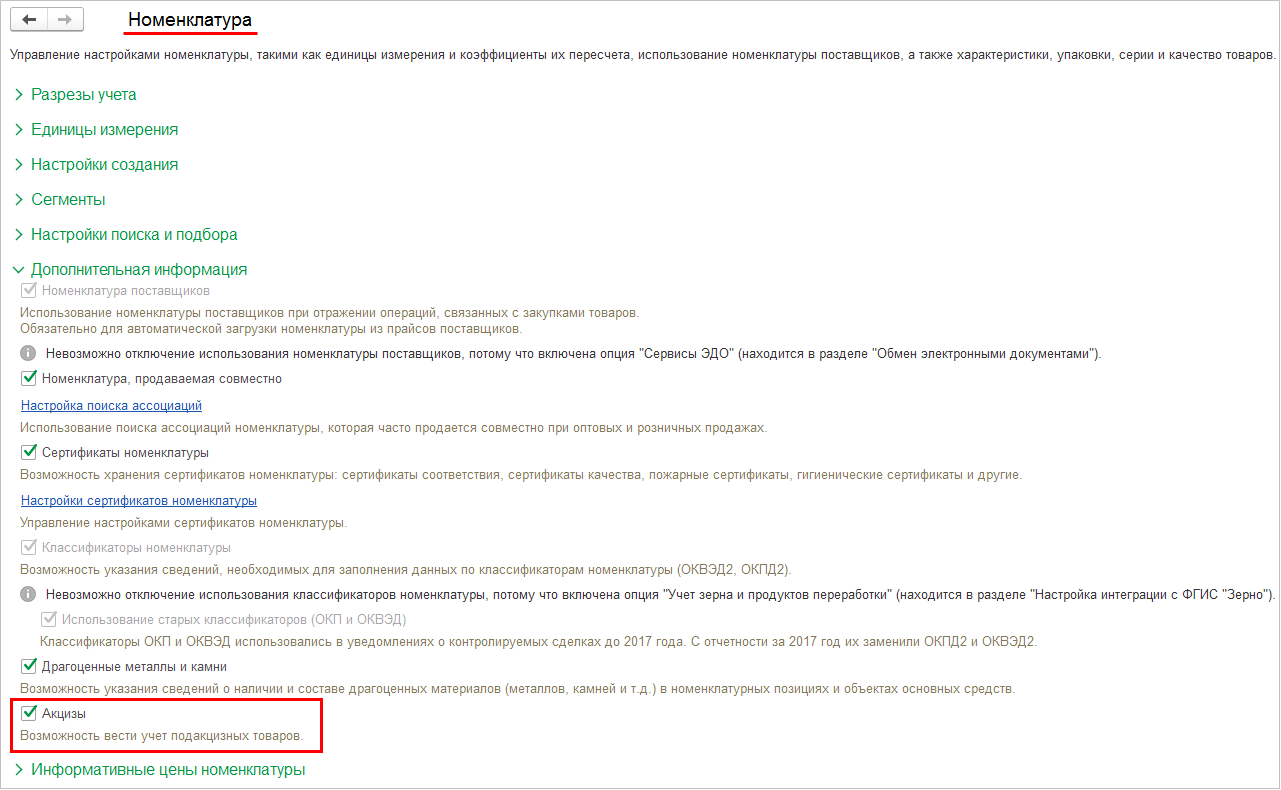 Ведение в информационной базе учета подакцизных товаров и доступность параметров учета акцизов определяется новой функциональной опцией Акцизы (меню НСИ и администрирование – Настройка НСИ и разделов – Номенклатура – Дополнительная информация).
