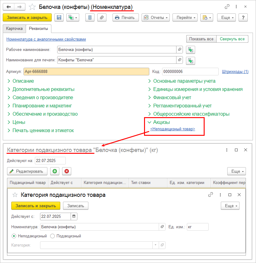 Категорию подакцизных товаров необходимо указать в карточке элемента списка Номенклатура, в которую добавлена группа настроек Акцизы. Информация о принадлежности номенклатуры к категории подакцизных товаров реализована в виде гиперссылки. Флажок Подакцизный товар из карточек элементов списков Виды номенклатуры и Номенклатура удален.
