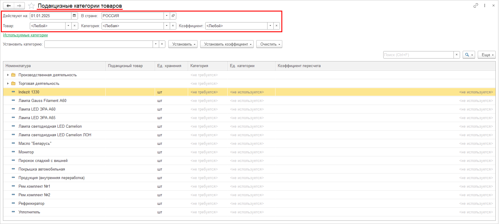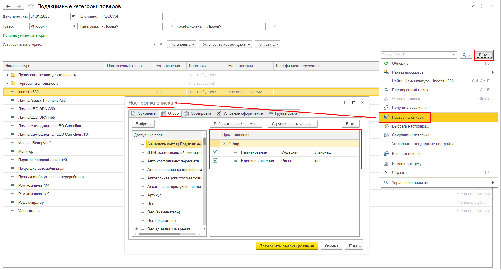 В табличной части рабочего места Заполнение категорий подакцизных товаров по команде Еще – Настроить список можно установить дополнительные отборы для номенклатуры наложением условий с использованием стандартных видов сравнения (Равно/Не равно, В группе/Не в группе, Заполнено/Не заполнено и пр.)
