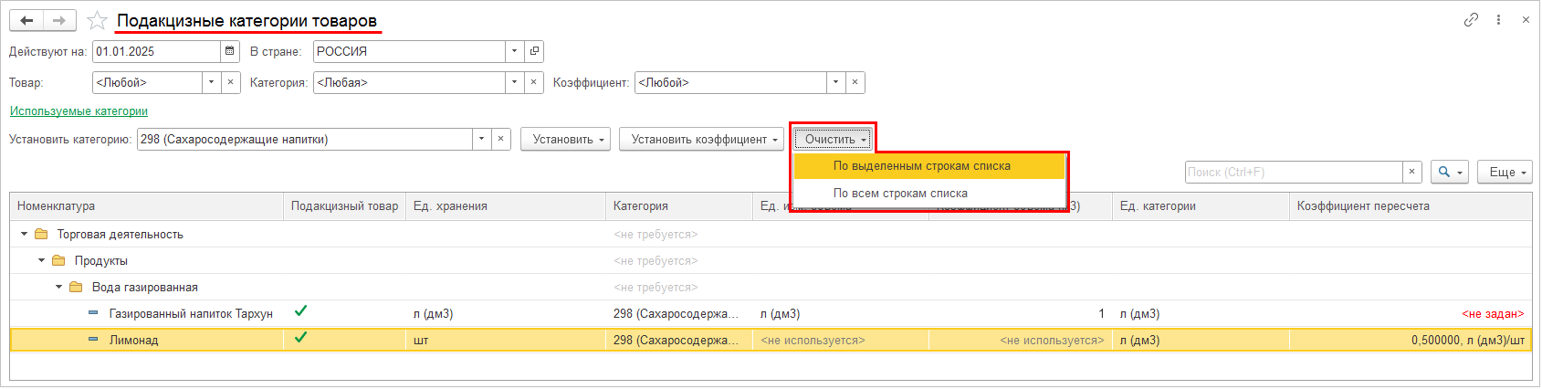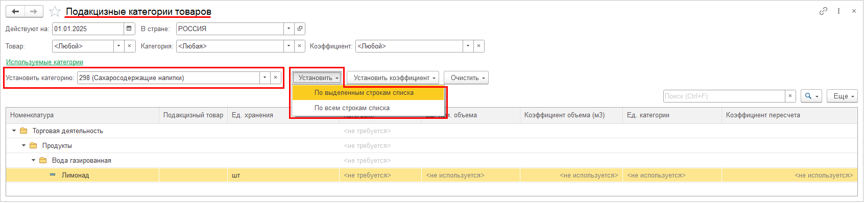 Для того чтобы указать/изменить категорию подакцизного товара в отобранных карточках номенклатуры необходимо: