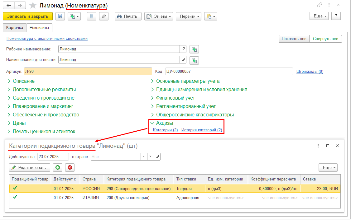 Информация о подакцизности/неподакцизности товара и настроенности категорий доступна по гиперссылке в группе настроек Акцизы в карточке элемента списка Номенклатура. Если для номенклатуры указана категория подакцизных товаров, тогда дополнительно доступна гиперссылка История категорий, по которой выполняется переход ко всем записям по изменению категорий подакцизности номенклатуры.