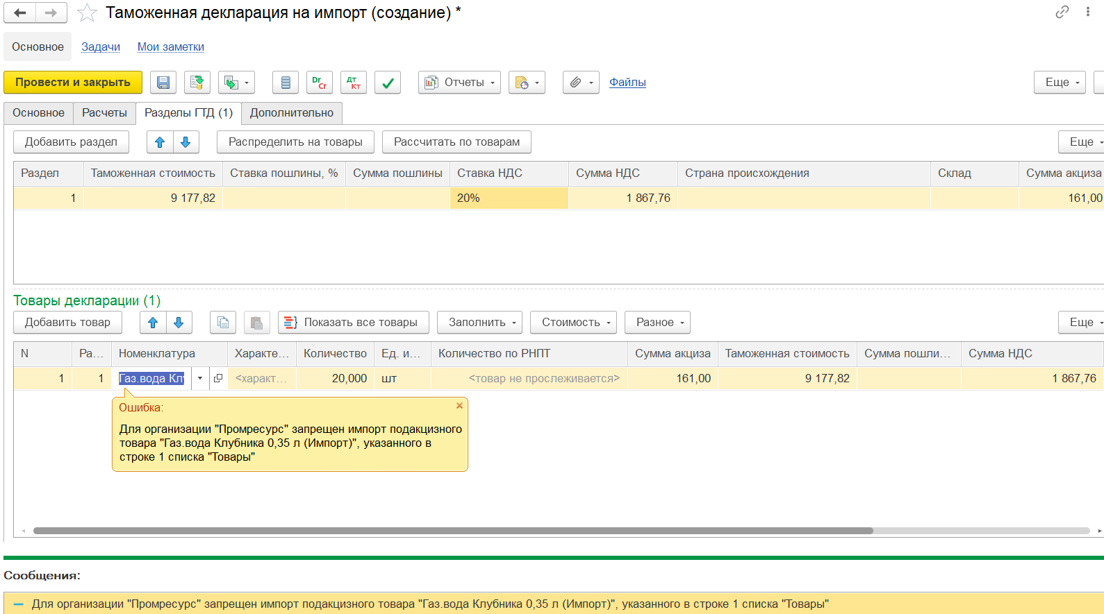 Для расчета, начисления и отражения суммы акциза для подакцизных импортных товаров предназначен документ Таможенная декларация на импорт, оформляемый по данным документа Приобретение товаров и услуг с операцией Импорт.