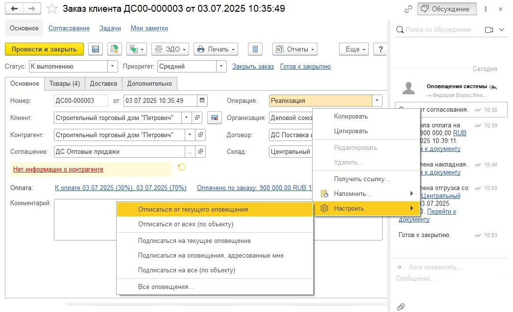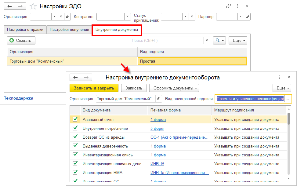 Эти колонки по умолчанию скрыты. При необходимости эти колонки можно вывести в документ через команду «Еще - Изменить форму» в обеих табличных частях. При проведении проверяется, что выбранные значения соответствуют аналитике учета по партнерам движений исходного документа, если выбраны неправильно – будет сообщение об ошибке.