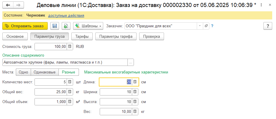 Улучшен пользовательский интерфейс для задания параметров грузовых места на (длина × ширина × высота, вес). Предусмотрен выбор следующих вариантов: