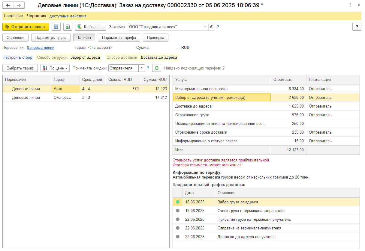 Поддержана возможность указания промокода при оформлении заказа на доставку. Промокод указывается на закладке Основное. Использование промокода так же влияет на стоимость перевозки и отражается в описании услуг тарифов