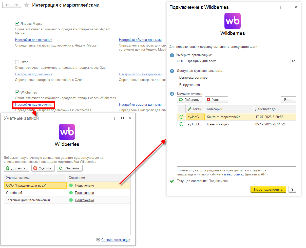 Для управления ценами и скидками в форме настройки подключения необходимо добавить токен маркетплейса, позволяющий обмениваться информацией по ценам через API. Для этого нужны категории токена «Контент» и «Цены и скидки». Категории можно комбинировать из разных токенов.
