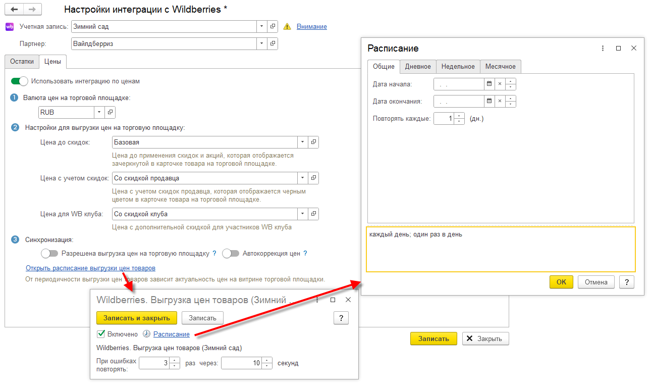 Выгрузка цен для расчета из информационной системы 1С в сервис интеграции (без публикации на Wildberries) осуществляется по ручной команде или регламентным заданем. Полная выгрузка производится при первом подключении. Для публикации цен необходимо активировать опцию Разрешена выгрузка цен на торговую площадку. Её можно включать и выключать в любой момент времени, например, это удобно для проверки произведенных расчетов перед публикацией.