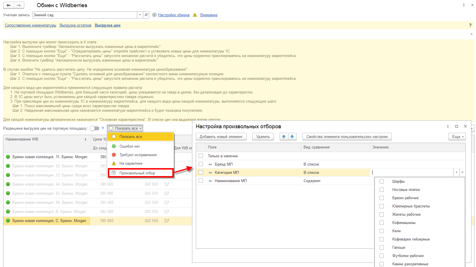 Имеется возможность установки отборов по наличию ошибок установки цен, а также установки произвольных отборов. Произвольный отбор можно настроить, в частности, по данным торговой площадки: Бренду, Категории, Наименованию. Список выбора по данным торговой площадки заполняется автоматически.
