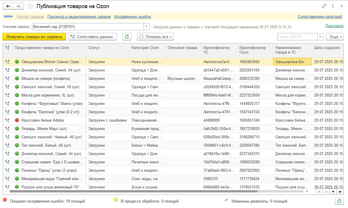 После загрузки карточек товаров с торговой площадки в таблице отображается в том числе Представление товара на Ozon, Идентификатор Ozon и Категория маркетплейса. Слева от графы Представление товара на Ozon, отображается пиктограмма, отражающая необходимость загрузки или обновления информации в информационной базе.