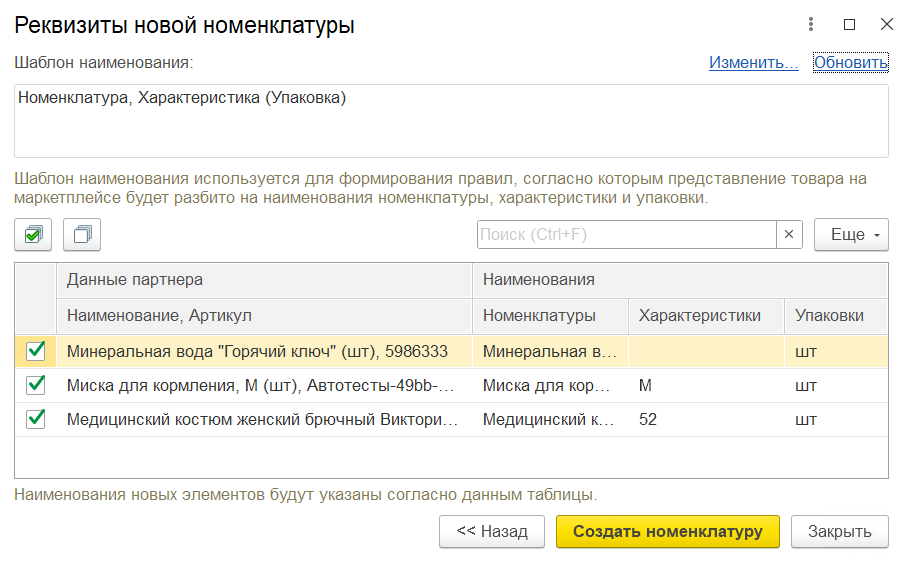 Наименование номенклатуры и характеристики можно отредактировать вручную. По кнопке Создать номенклатуру можно создать объекты информационной базы для отмеченных позиций.