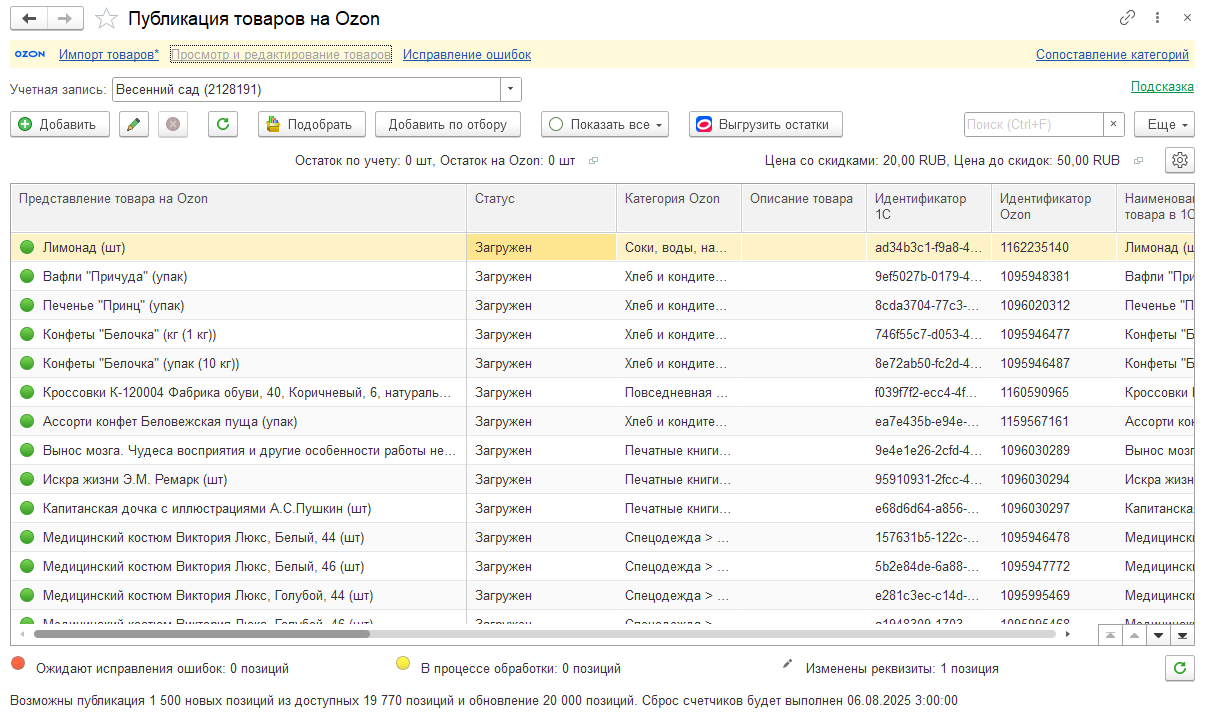 На странице Просмотр и редактирование товаров в форме Публикация товаров на Ozon команда Еще – Выполнить обновление товарного каталога выполняет публикацию подготовленных карточек товаров и проверку результата прохождения модерации ранее опубликованных, а также позволяет актуализировать данные с торговой площадки для выделенных позиций сопоставленного товарного каталога в случае их изменения на торговой площадке. Для обновления не будут доступны товары в статусах К публикации и На модерации.