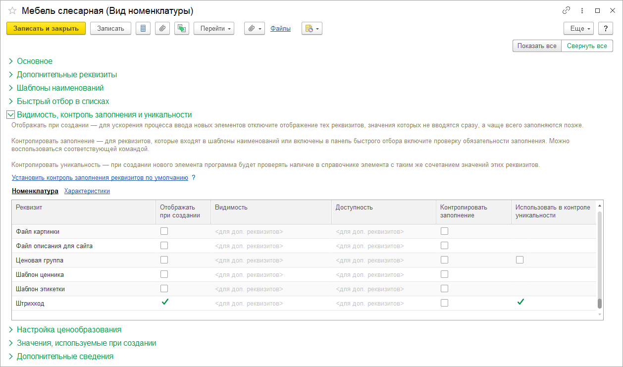 В карточке Вида номенклатуры в таблице настроек Видимость, контроль заполнения и уникальности предусмотрена возможность настройки работы с реквизитом Штрихкод, при создании новой карточки Номенклатуры. Если не установлена настройка НСИ и администрирование – Настойки НСИ и разделов – Номенклатуры – Настройки создания – Неуникальные штрихкоды номенклатуры контроль уникальности для штрихкода не отключается. При включении общей настройки флаг становится доступным для редактирования, таким образом можно разрешить или запретить неуникальные штрихкоды для конкретного вида номенклатуры.