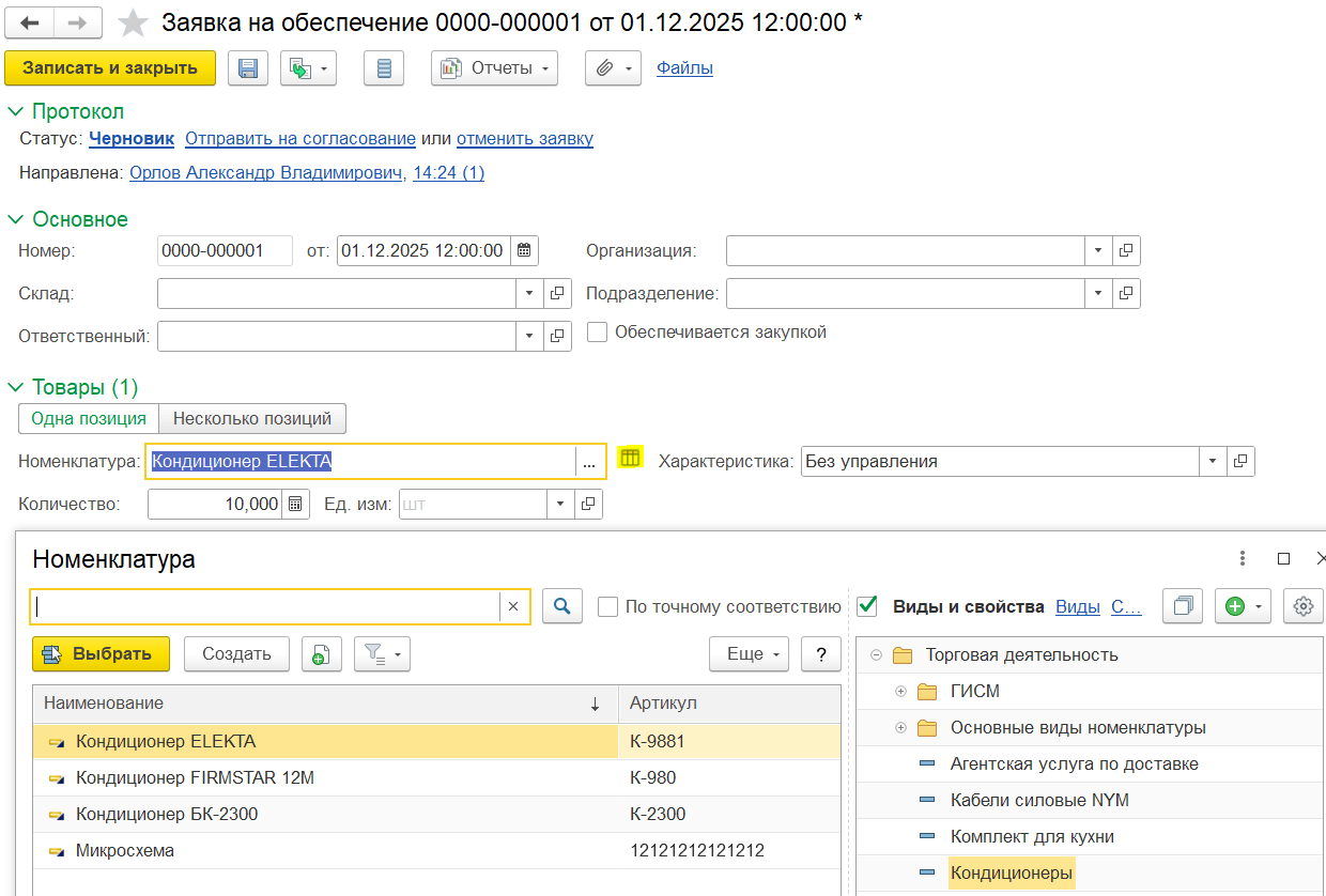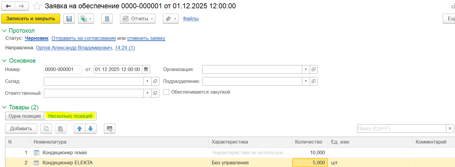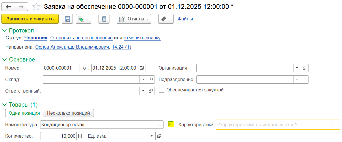 Заявка на обеспечение создается из списка документов Заявки на обеспечение (Склад и доставка – Внутреннее товародвижение – Заявки на обеспечение) и в статусе Черновик, при котором не обязательны для заполнения до начала выполнения заявки поля Организация, Подразделение, Ответственный, Склад. Эти поля заполняются по статистике при создании заявки.