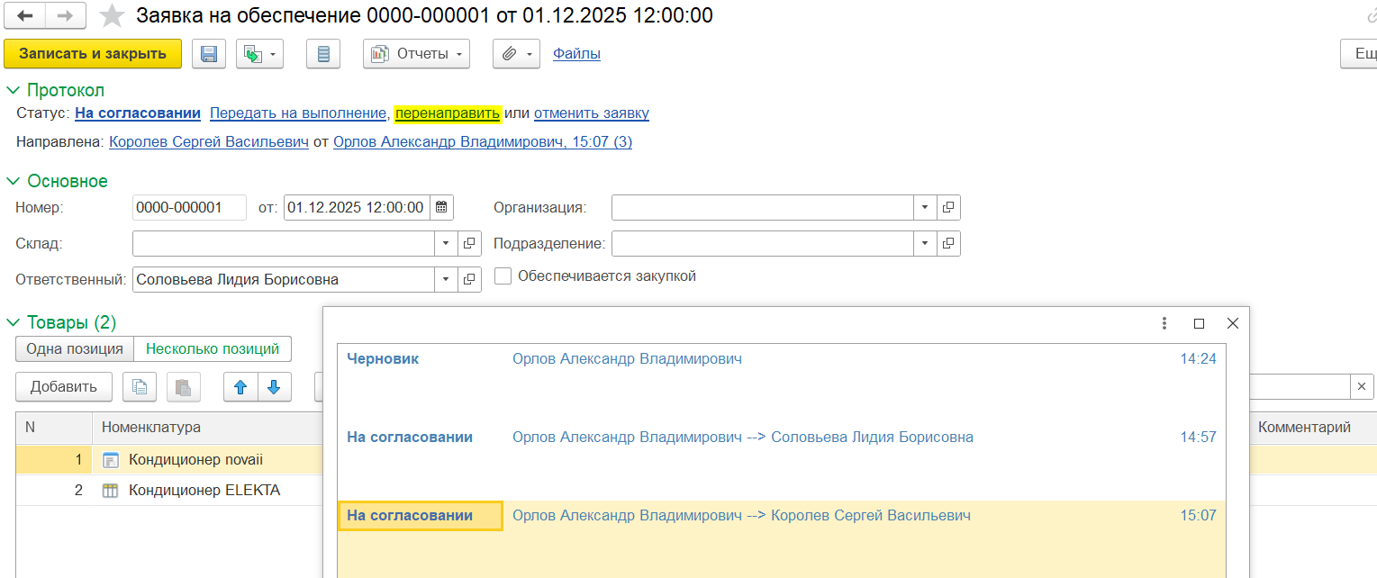После того как заявка будет отправлена на согласование, то заявке присваивается статус На согласовании, на форме заявки будет отображена информация о перенаправлении: кому, от кого, когда и количество записей в разделе «Протокол».