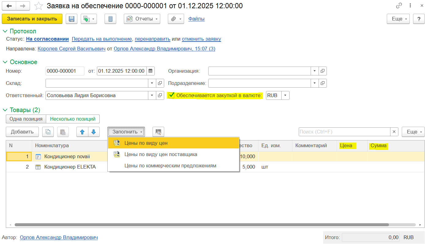 После того как будут созданы коммерческие предложения, можно в заявке заполнить цены по подобранным в запросе коммерческим предложениям и вернуть на согласование ответственному лицу.