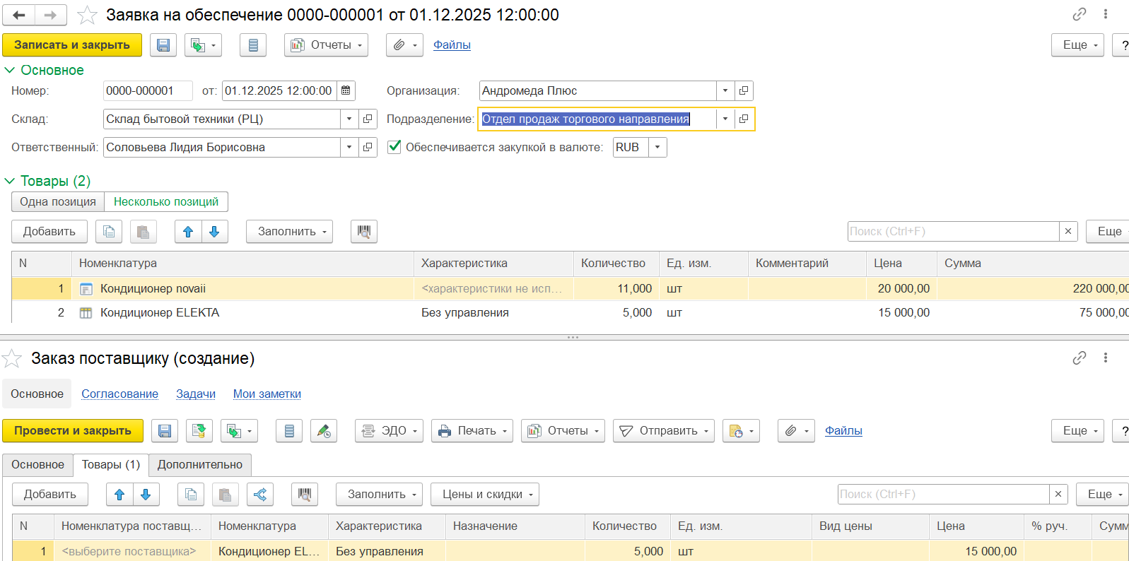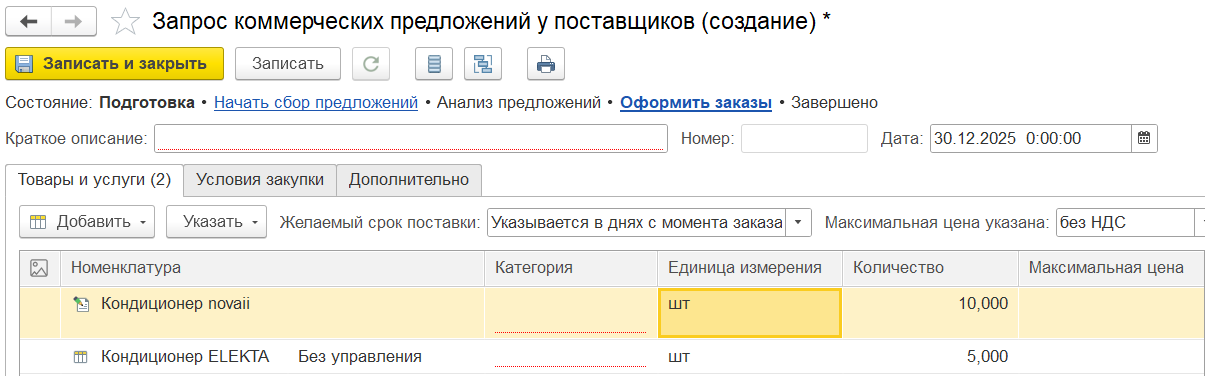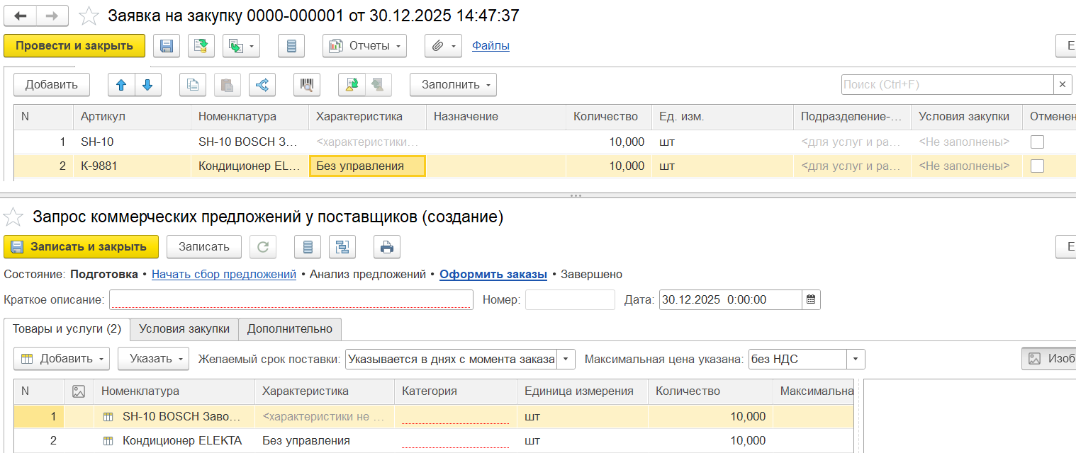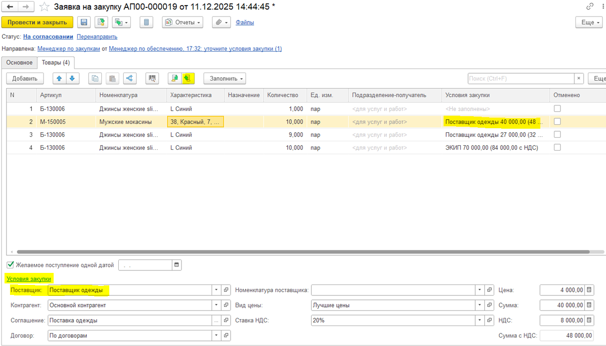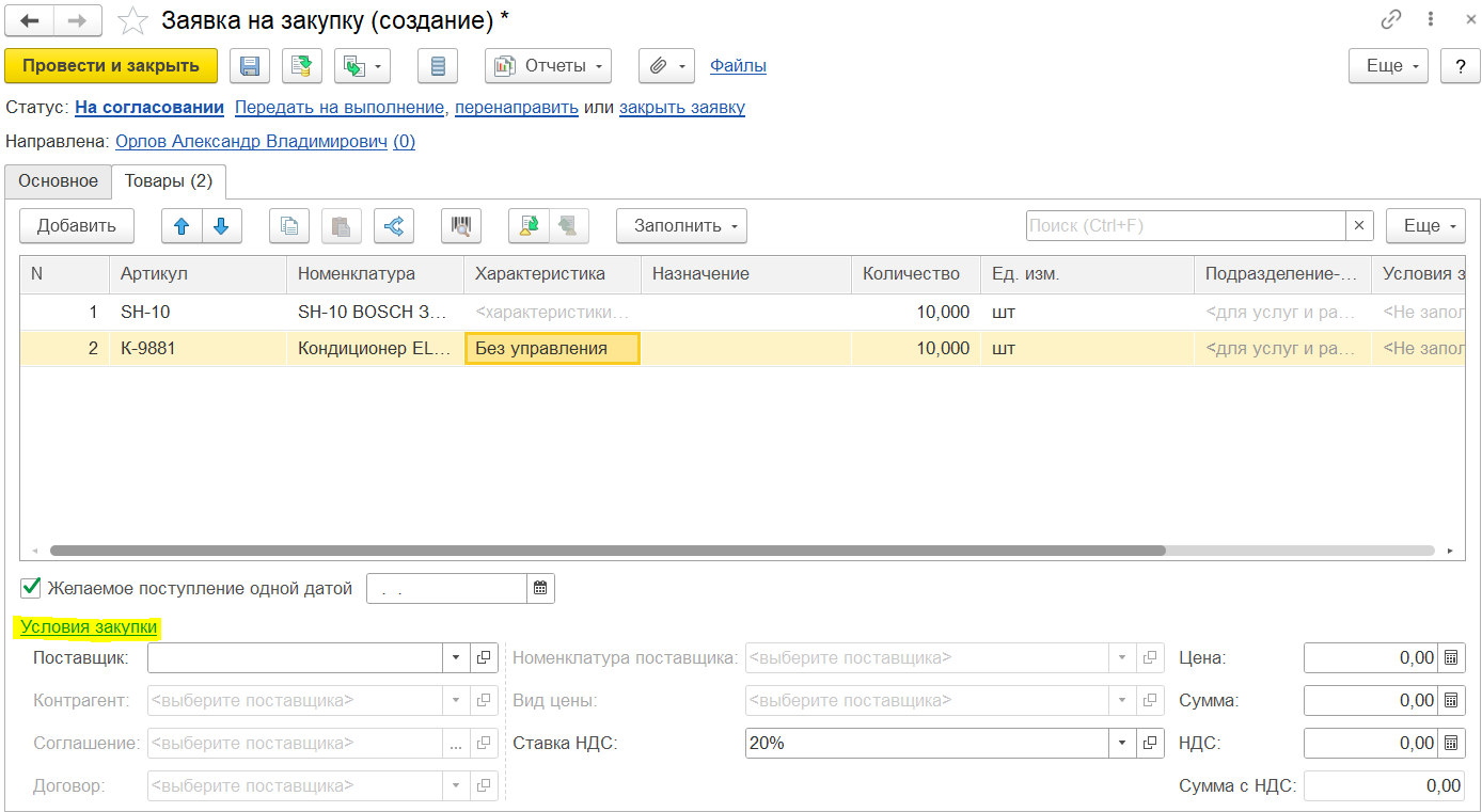 Заявитель не знает, у какого партнера и по каким ценам выполняется закупка, поэтому на первом этапе работы с документом не подразумевается работа с условиями закупки. Например, при подборе товаров не предусмотрена информация о цене, только о количестве.