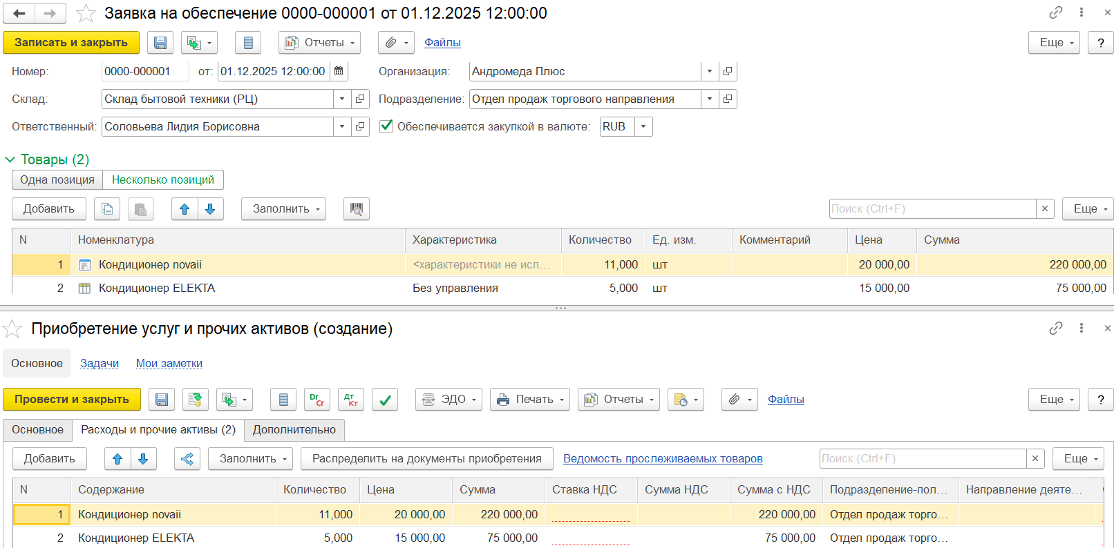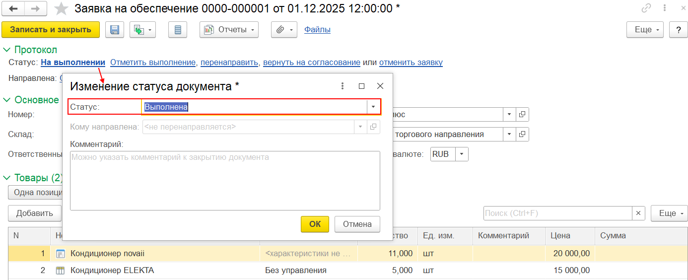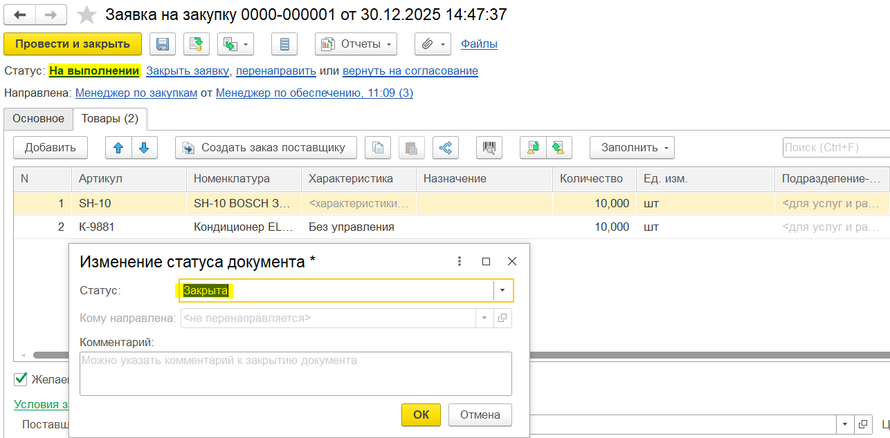 В заявке в статусе «На выполнении» заполнение реквизитов Склад, Организация, Подразделение, Ответственный является обязательным.