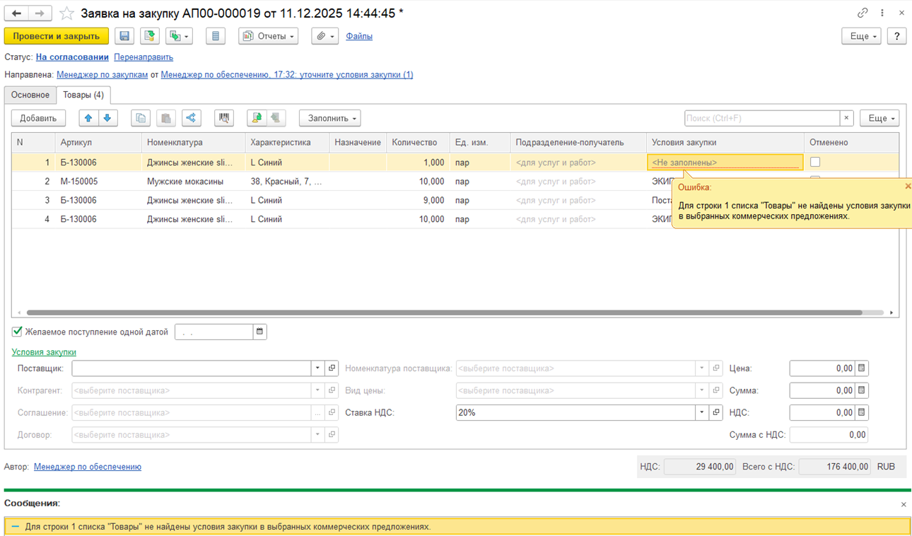 При повторной попытке для четвертой строки заполнить цену (условия закупки) по коммерческому предложению также будет выведено сообщение о том, что «не найдены условия закупки в выбранных коммерческих предложениях».