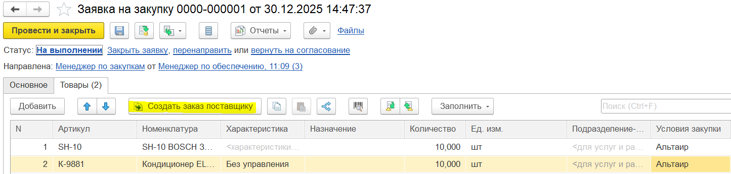 Поэтому строковые потребности (которые не зарегистрированы в справочнике «Номенклатура») на этапе выполнения заявки необходимо заменить на номенклатуру из справочника «Номенклатура» либо обеспечивать с помощью документа «Приобретение услуг и прочих активов».