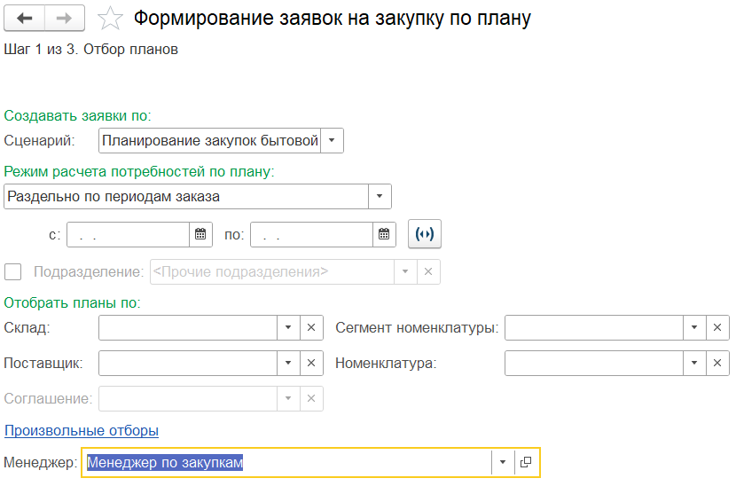 Пользователи формируют потребности. Например, менеджеры по продажам могут сформировать заказы клиентов, менеджер по обеспечению формирует обеспечивающие потребности документы с помощью рабочего места Формирование заявок на закупку по потребностям – заявки на закупку, которые назначаются менеджеру по закупкам. Менеджер по закупкам (исполнитель) может быть указан в способе обеспечения потребностей, из которого наследуется в документы заявок на закупку, сформированные с использованием рабочего места Формирование заявок на закупку по потребностям.