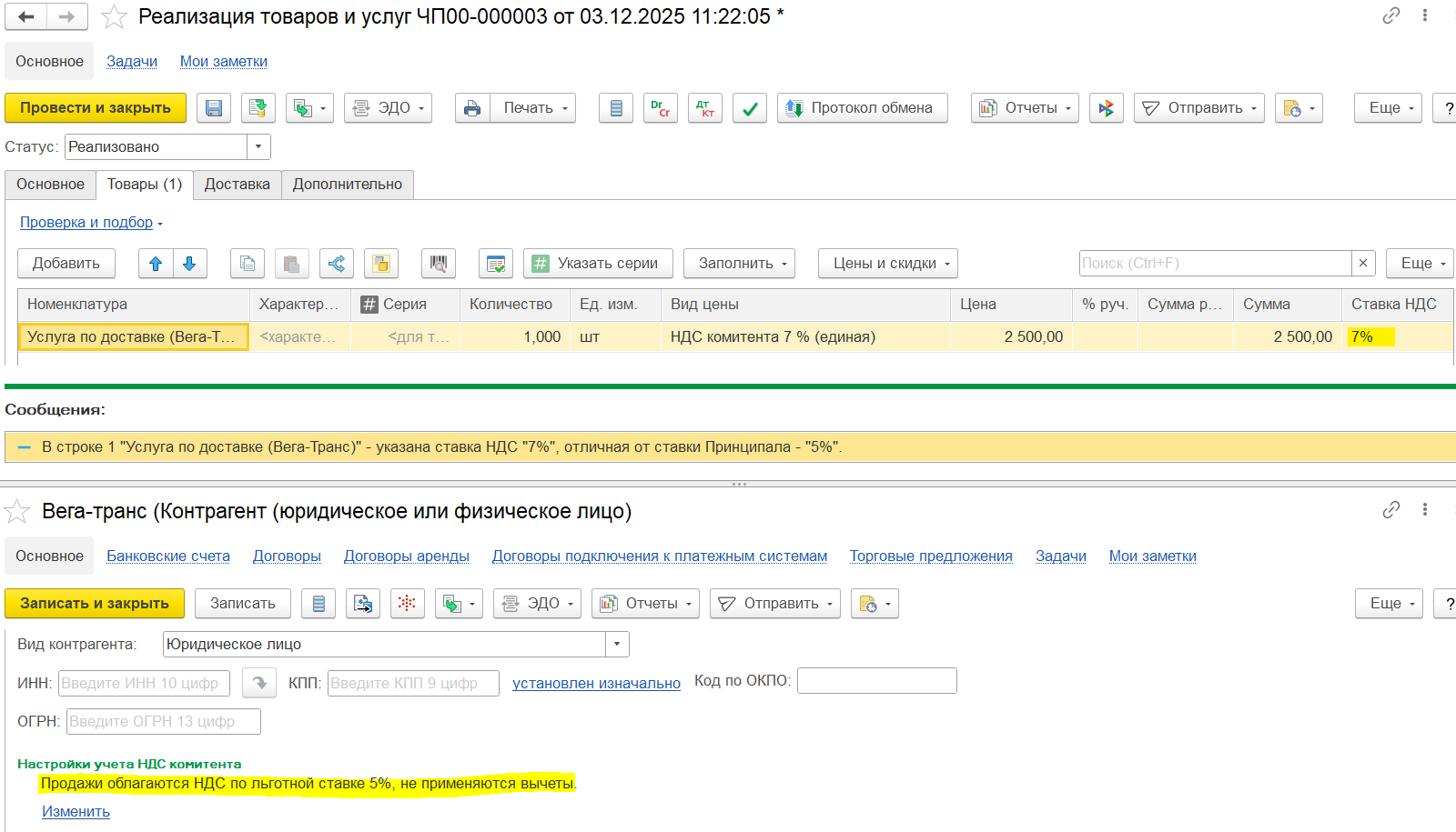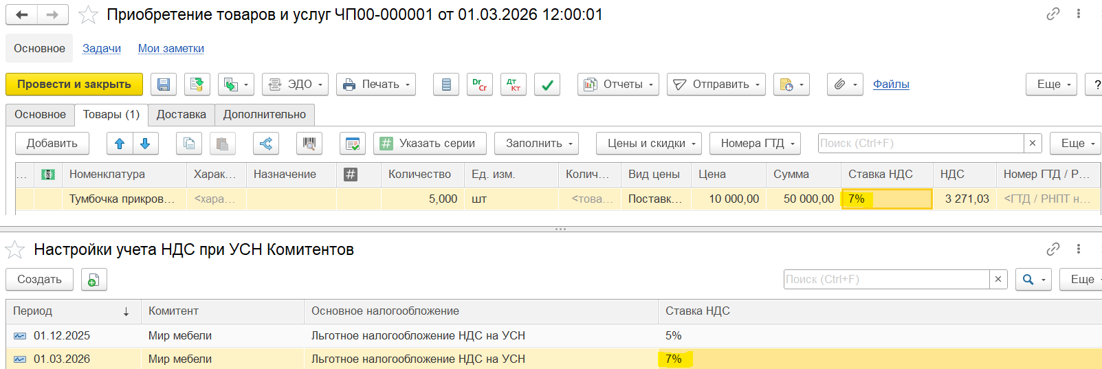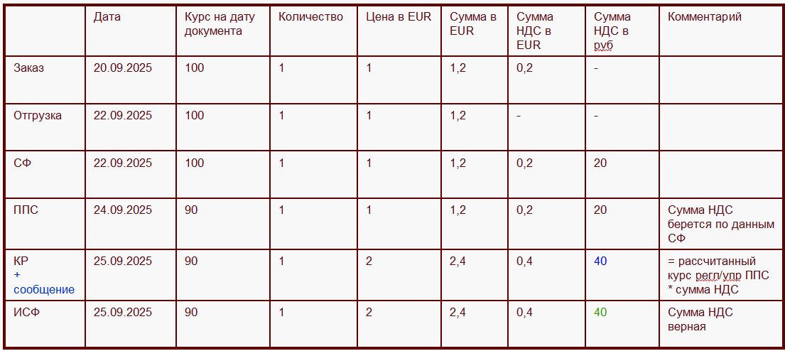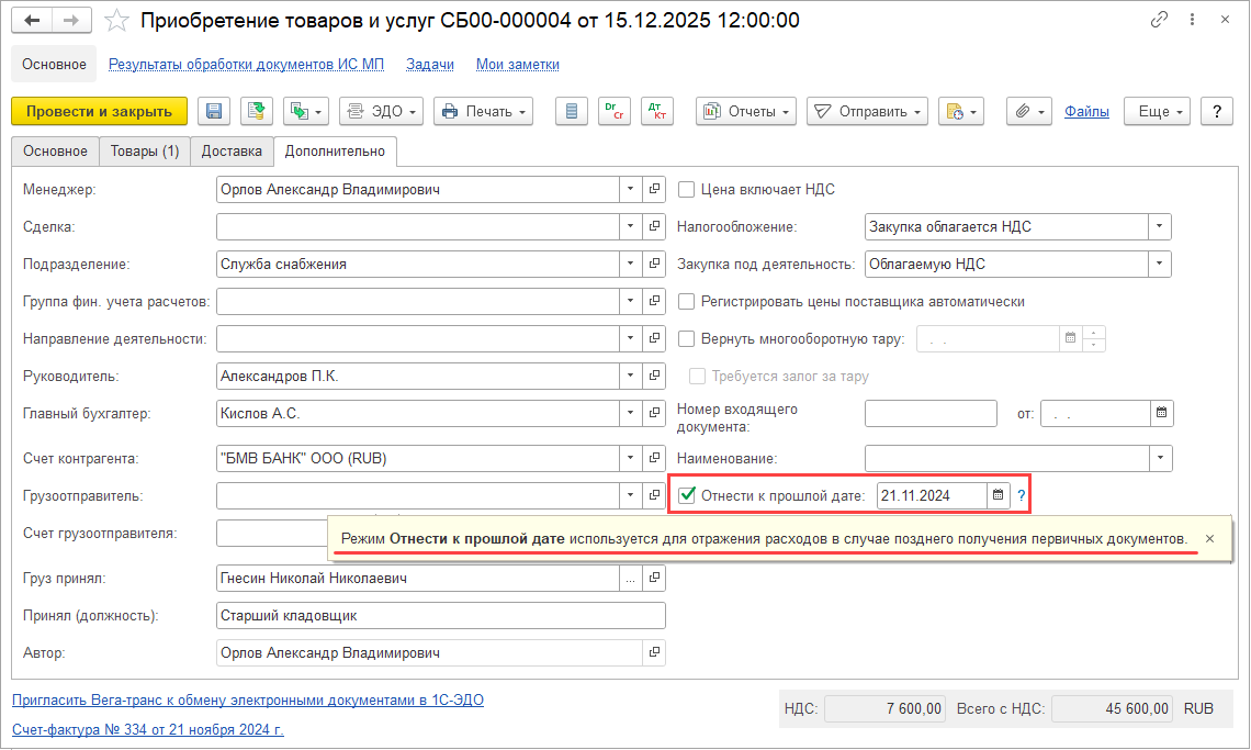 Если в текущем квартале вводится сторно приобретения товаров и услуг предыдущего квартала и в этом же месяце исправляется база распределения предыдущего квартала, то могут возникать восстановления НДС. В данном сценарии рекомендуется использовать поквартальное формирование вычетов и восстановлений НДС (настройка учетной политики организации Периодичность формирования вычетов и восстановлений НДС), чтобы минимизировать лишние вычеты и восстановления.