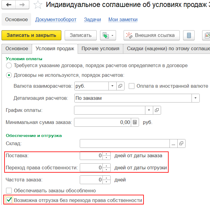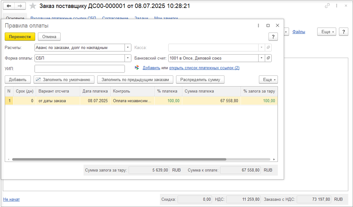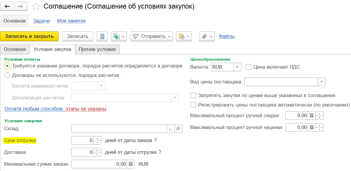 Условия закупки будут заполнены позднее менеджером по закупкам. На первом этапе работы с документом условия закупки можно скрыть, нажав на гиперссылку «Условия закупки».