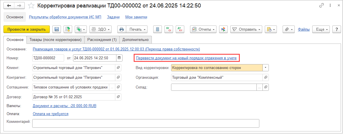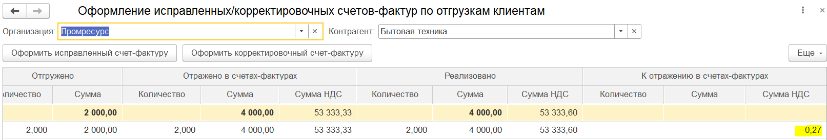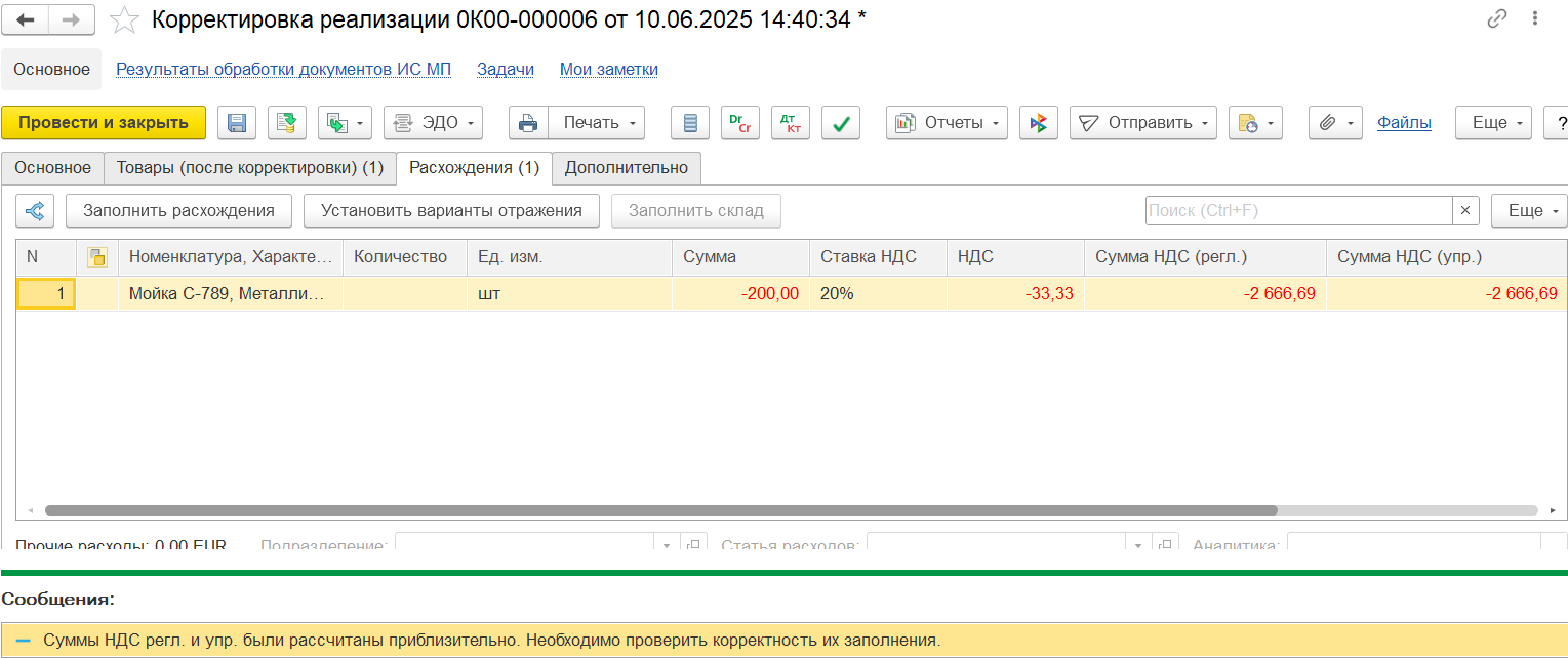 Документ Распределение НДС подключен к механизму исправлений финансовых документов, доступному, если в информационной базе включена функциональная опция Исправление и сторно финансовых документов (меню НСИ и администрирование – Настройка НСИ и разделов – Финансовый результат и контроллинг – Исправление и проверка документов).