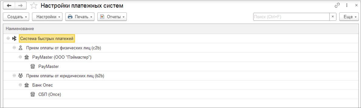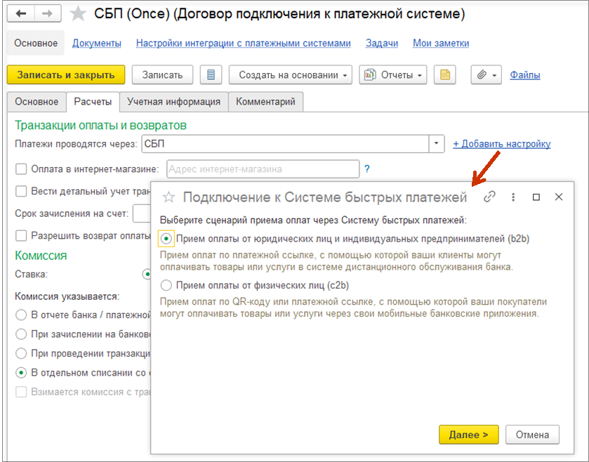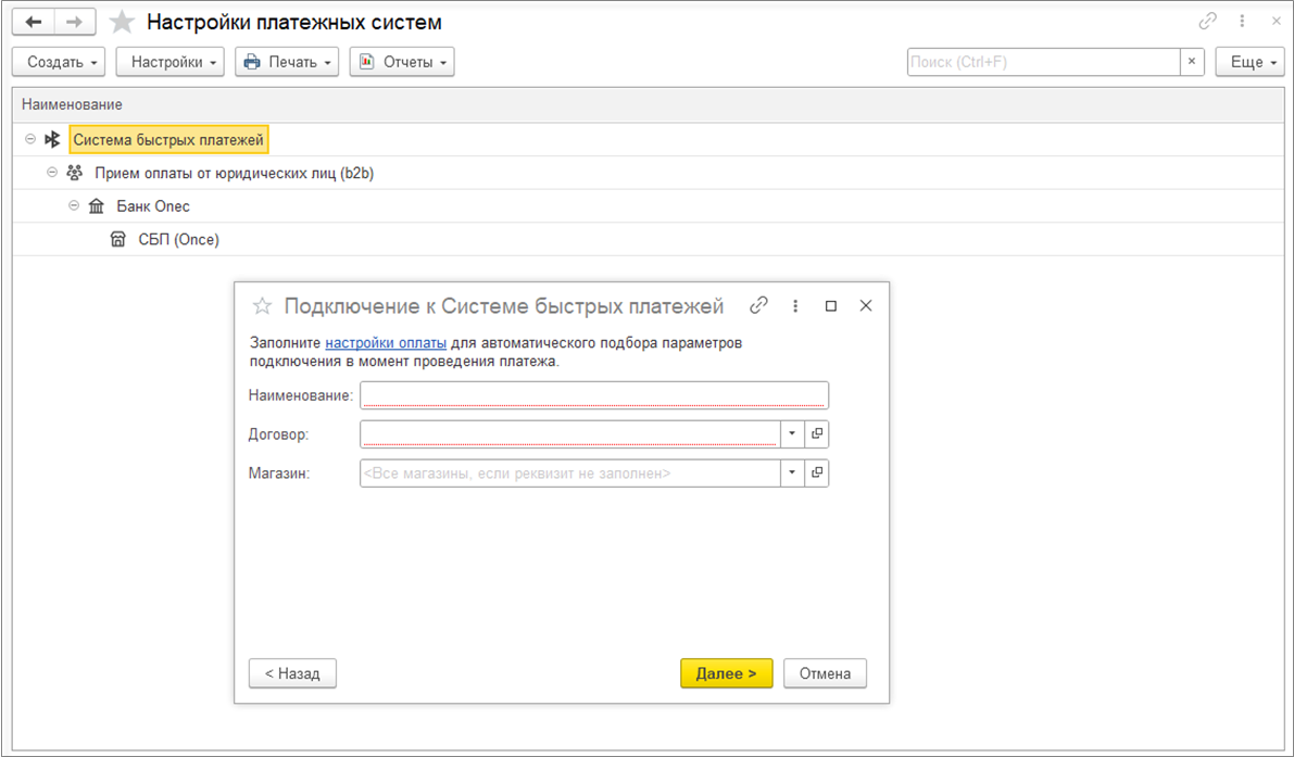 Подключение онлайн-заказов настраивается в разделе НСИ и администрирование – Администрирование - Интернет-поддержка и сервисы - Онлайн-заказы - гиперссылка Настройки страниц. В открывшемся окне необходимо нажать на кнопку Создать и выбрать настройки СБП для c2b и b2b переводов, если существуют настройки подключения СБП.