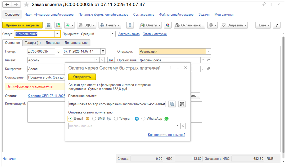 Создание и отправка ссылки на сформированный онлайн-заказ доступно в документе Заказ клиента с помощью кнопки Онлайн-заказ.