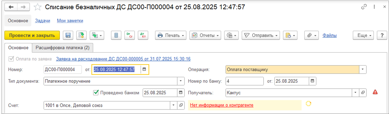 Для документов Поступление безналичных денежных средств с операцией Поступление оплаты по эквайрингу поддержана выгрузка и загрузка реквизитов Статья расходов и Договор эквайринга.
