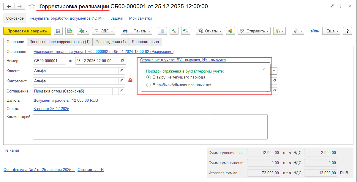 При изменении данных к распределению в результате оформления корректировки приобретения или исправления первичных документов прошлого периода изменение распределения НДС учитывается в периоде исправления (отражается в документе Распределение НДС за период, к которому относится исправление), но распределение выполняется по базе периода исправляемого документа.