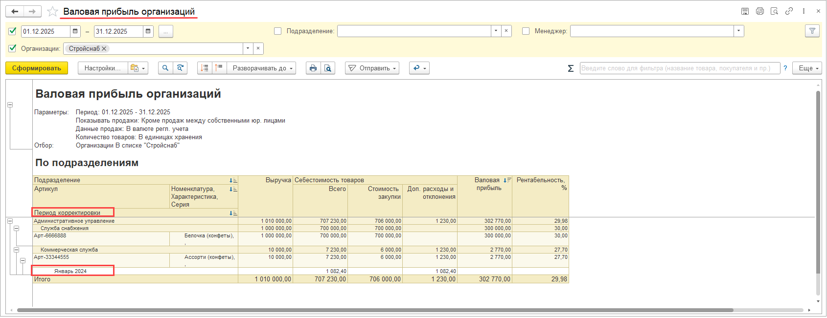 В отчетах Валовая прибыль предприятия/Валовая прибыль организаций в поле Период корректировки выводится месяц прошлого периода.