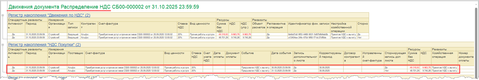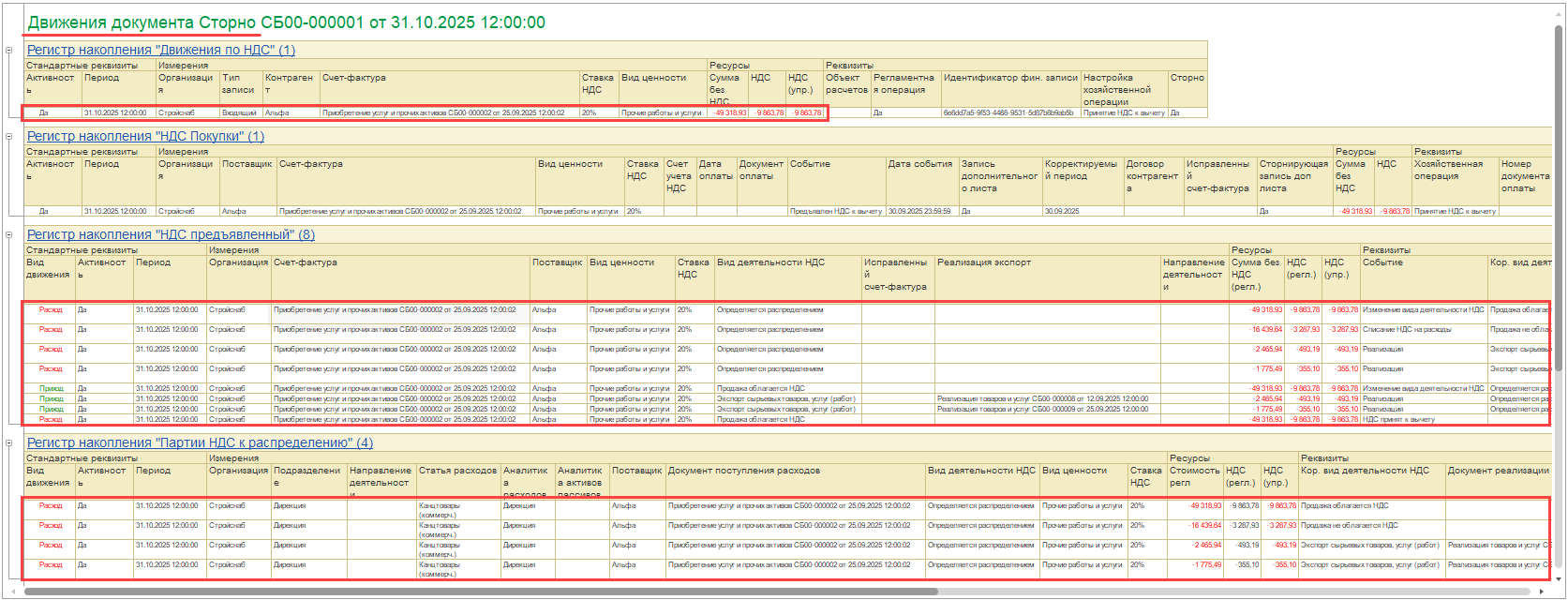 При сторнировании документа Распределение НДС полностью сторнируются все его движения по регистрам.