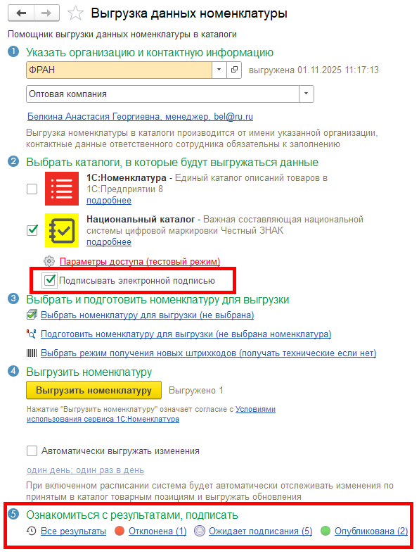 Эти статусы отображаются в нижней части формы Выгрузка данных номенклатуры и в форме Результаты выгрузки номенклатуры в Национальный каталог. Статус Принята соответствует как карточкам, ожидающим подписания в личном кабинете национального каталога, так и подписанным и опубликованным карточкам.