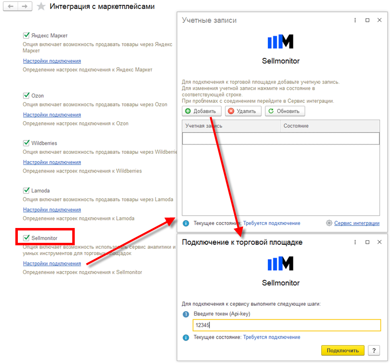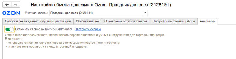 При включенном сервисе аналитики Sellmonitor в таблицах сопоставления складов информационной базы и торговой площадки в форме настройки обмена данными для учетной записи торговой площадки дополнительно настраивается соответствие складов для Sellmonitor.