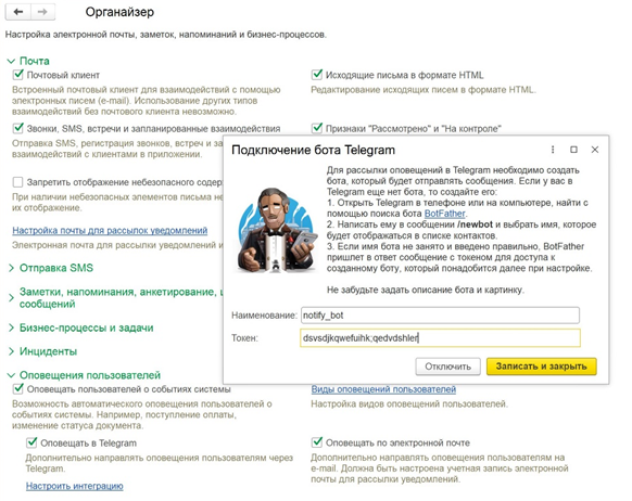 Включить оповещения, а также настроить список активных оповещений можно в разделе НСИ и администрирование – Администрирование – Органайзер после регистрации базы в системе взаимодействия. Также можно включить возможность отправки оповещений в Telegram и на электронную почту.