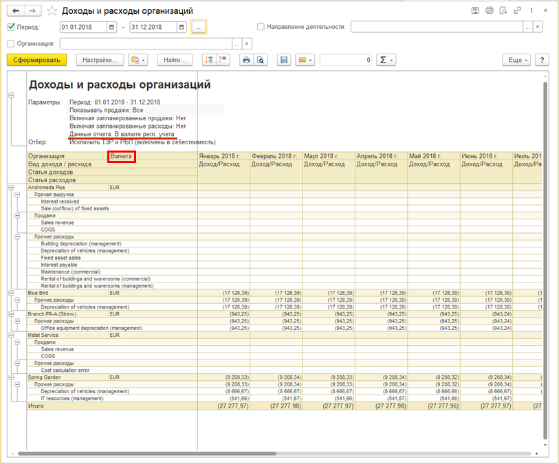 В настройки управленческих отчетов, строящихся в валюте регламентированного учета по нескольким организациям, добавлена группировка по валюте.