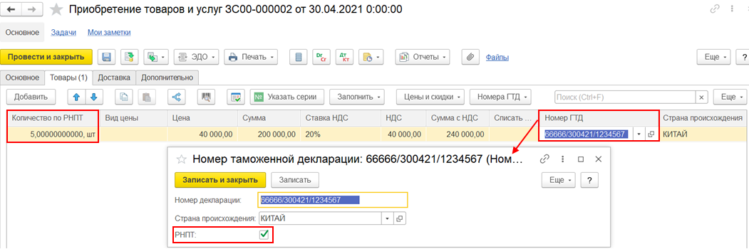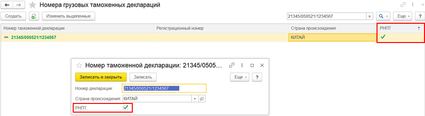 В справочнике Номера ГТД предусмотрен реквизит РНПТ, который означает, что элемент справочника является номером РНПТ.