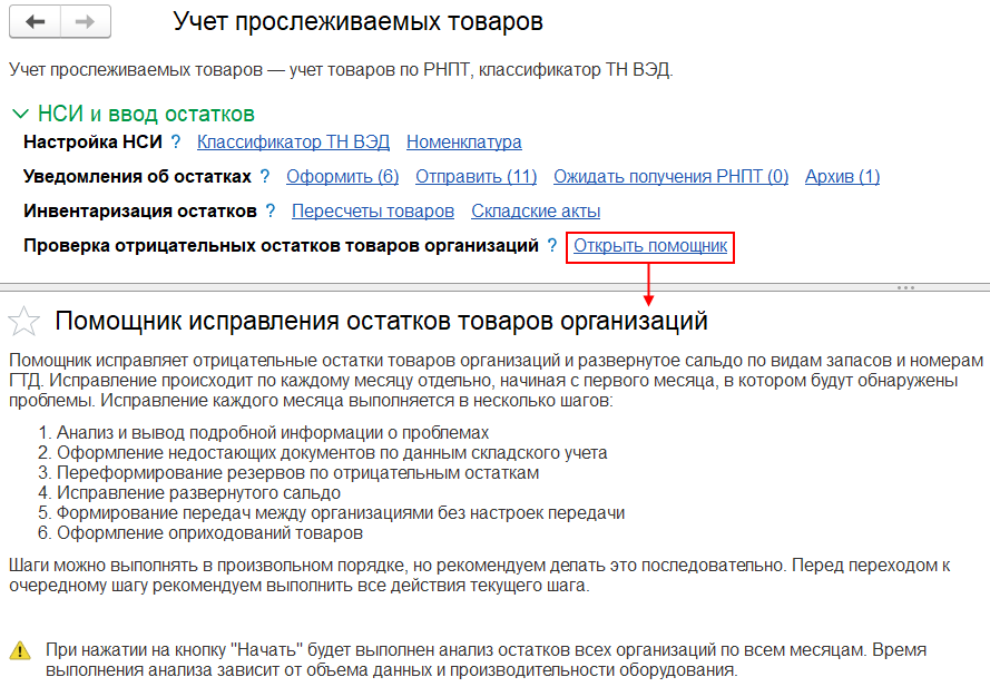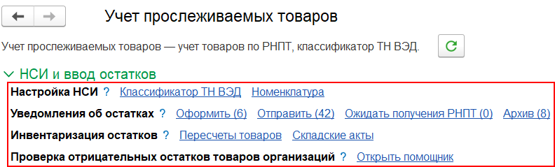 Предлагается методика по настройке нормативно-справочной информации и вводу остатков в виде помощника из четырех пунктов, встроенных в рабочее место по учету прослеживаемых товаров.