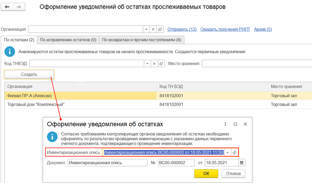 До оформления уведомлений необходимо провести инвентаризацию остатков товаров, подлежащих прослеживаемости.