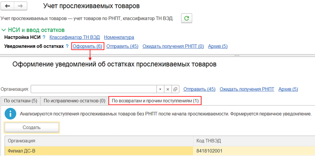 На закладке По возвратам и прочим поступлениям формируются данные в разрезе организаций и кода ТН ВЭД на основании документов, сформированных после даты начала ведения учета прослеживаемости. Предусмотрено формирование первичного уведомления.