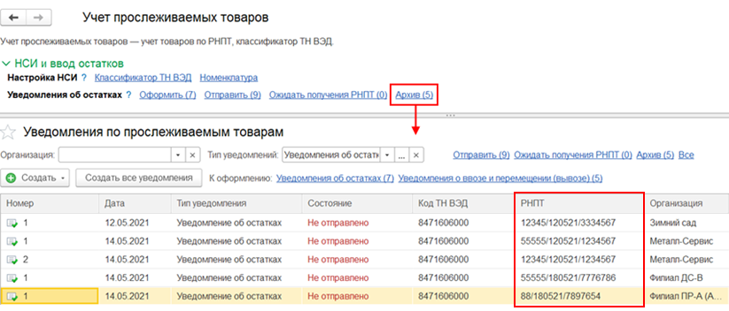 Список уведомлений по остаткам прослеживаемых товаров, по которым заполнены РНПТ, отображается в журнале Уведомления по прослеживаемым товарам (гиперссылка Архив).
