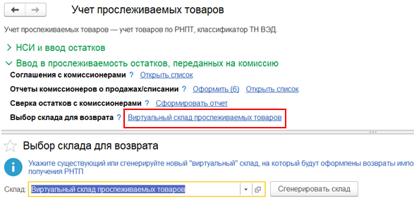 Если комиссионеру переданы товары на комиссию и на стороне комиссионера ведется учет прослеживаемых товаров, то в соглашении с типом операции Передача на комиссию устанавливается флаг Комиссионер ведет учет по РНПТ.
