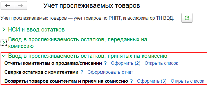По гиперссылкам «Ввод в прослеживаемость остатков, переданных на комиссию» можно перейти к рабочим местам по оформлению документов, к журналу уведомлений об остатках, отчетам, спискам документов.