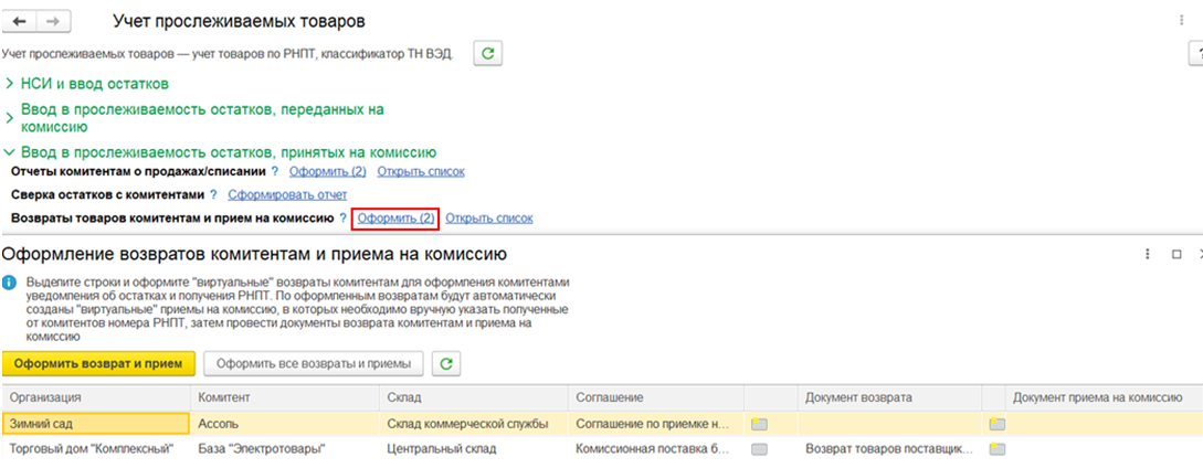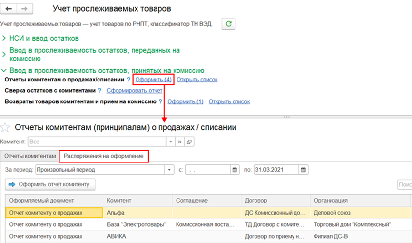 До даты начала учета прослеживаемости необходимо оформить отчеты комиссионеров о совершенных продажах и списании, а затем ввести товары в прослеживаемость. Отчет комиссионера о продажах нужно оформить до возврата, чтобы не получать РНПТ по товарам, по которым у комиссионера нет остатков.