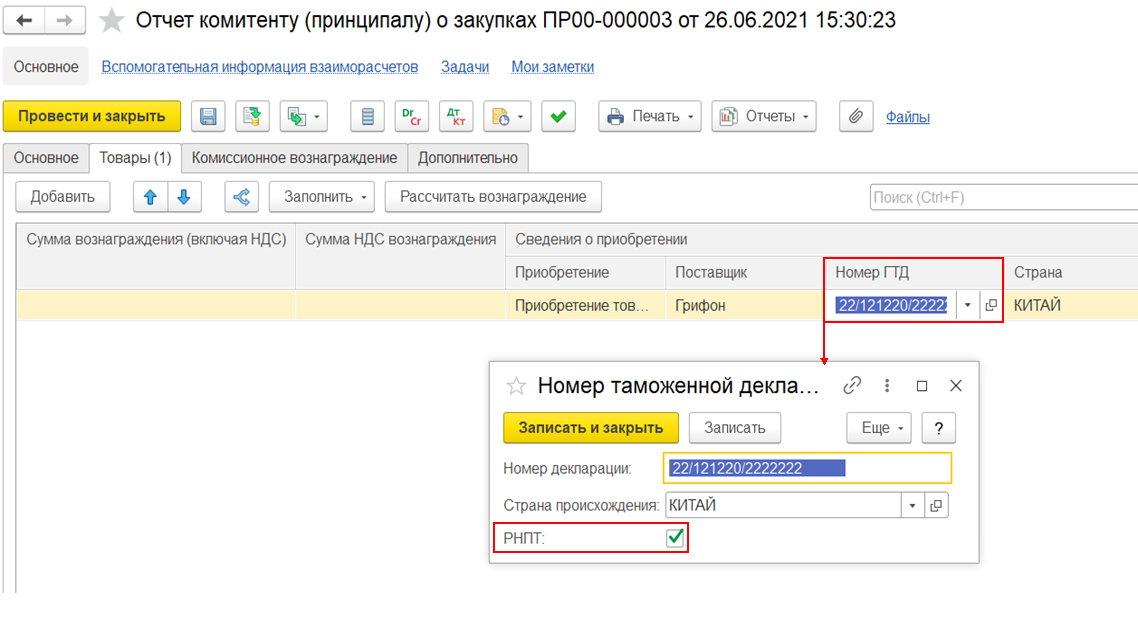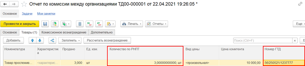 Для прослеживаемых товаров в отчете комиссионера (агента) обязательны для заполнения поля Количество по РНПТ и Номер ГТД. Если единица измерения номенклатуры совпадает с единицей прослеживаемости, то количество по РНПТ заполняется по количеству.