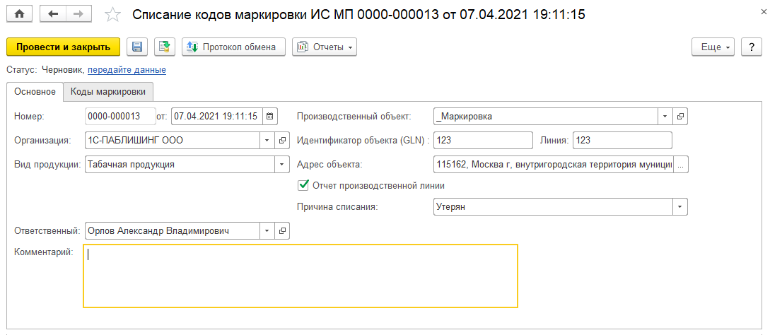 По результату применения команды по созданию будет сформирован документ Уведомление об остатках прослеживаемых товаров. Уведомление об остатках заполняется на основании первичного учетного документа, подтверждающего право собственности участника оборота товаров, подлежащих прослеживаемости.
