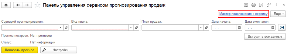 Для начала работы требуется открыть рабочее место Панель управления сервисом прогнозирования продаж и нажать на гиперссылку Мастер подключения к сервису.